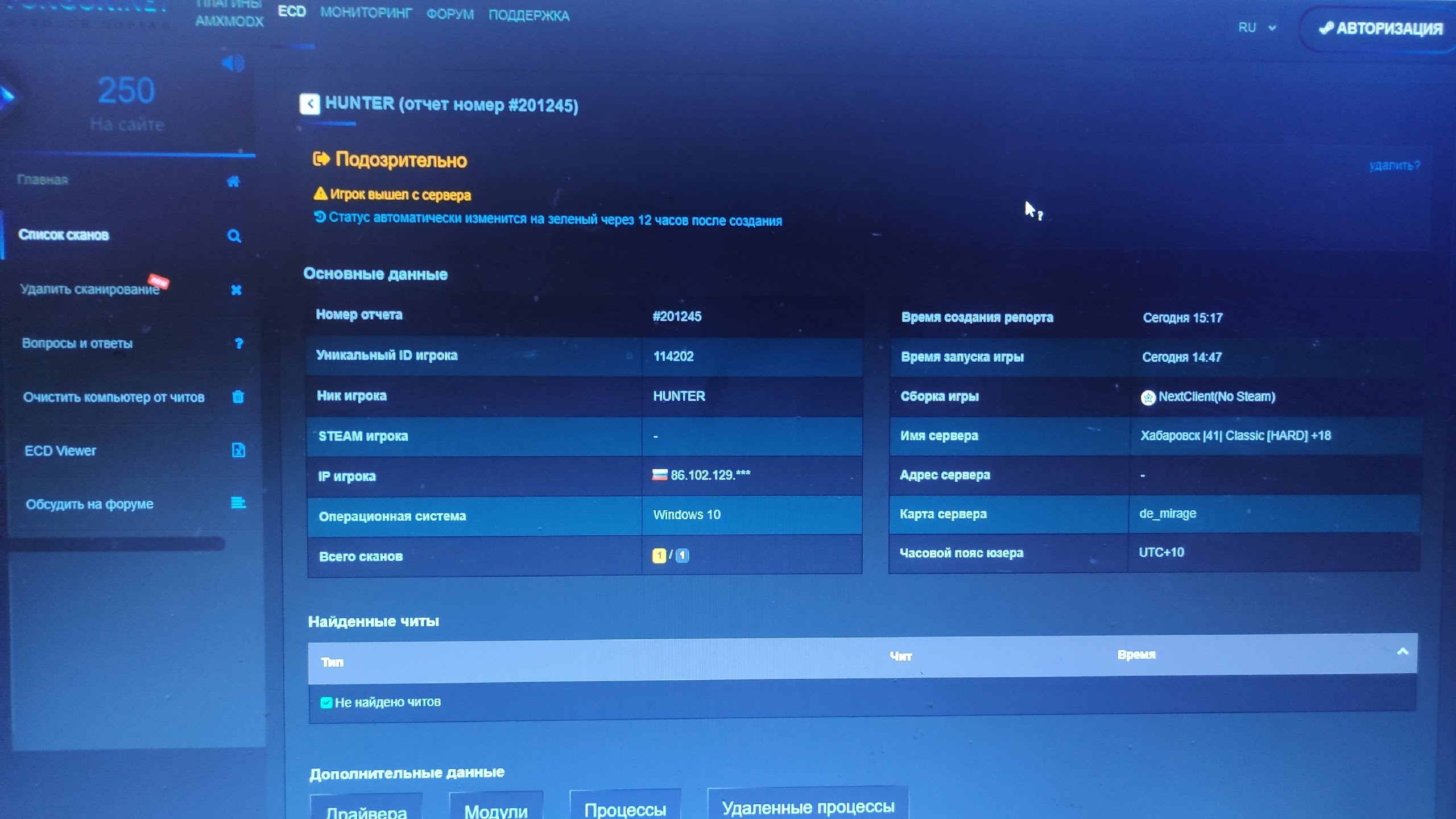 Здравствуйте! Играю уже очень давно на данном сервере и сегодня спустя долгого отсутствия, зашел снова на нем поиграть. Играю достаточно хорошо, отчего стал подозреваем только что, админом на сервере. НИ разу за все время никаких проверок раньше не было в мой адрес, но сегодня выдали. Пока я разюирался как пройти проверку на читы, меня выкинуло с сервера из за афк. Прошел проверку на читы успешно, но с сервера уже кикнуло, попытался зайти снова - бан 7 дней. Сегодня было очень хорошее настроение на что бы поиграть, теперь оно испортилось. можно ли как то справедливо получить разбан в самое ближайшее время?